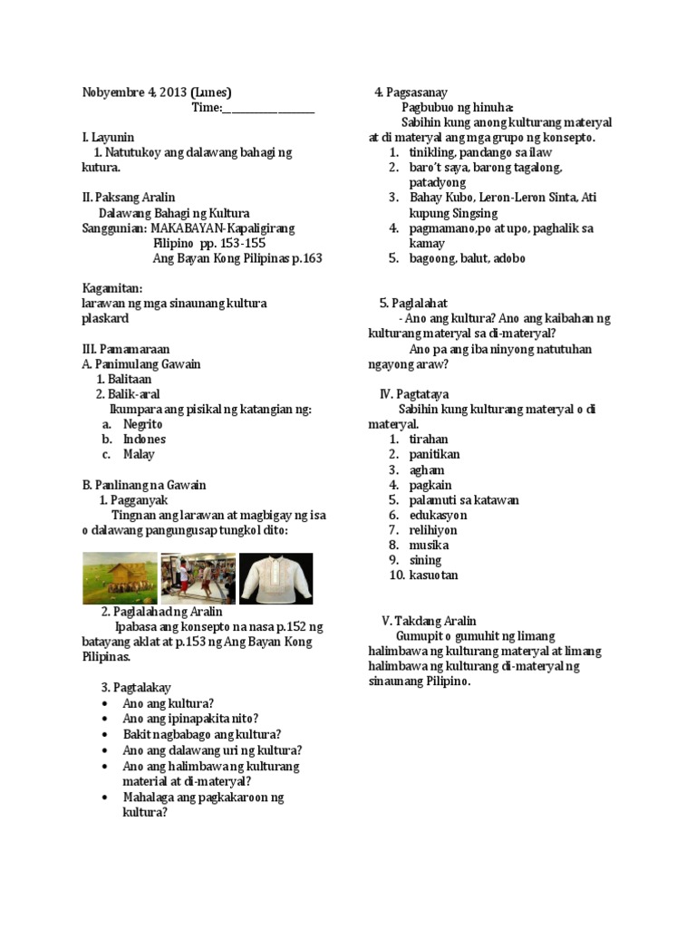 Materya at Di-Materyal by jlimbawan in Topics et lesson plan in hekasi 4. Worksheet will open in a new window. 06032017 Halimbawa ng mga Materyal na Kultura Paghahanda ng mga ibat-ibang pagkain tuwing pista Pagsusuot ng mga barong at saya Pagbibigay ng mga regalo at pera sa mga ikinasal.