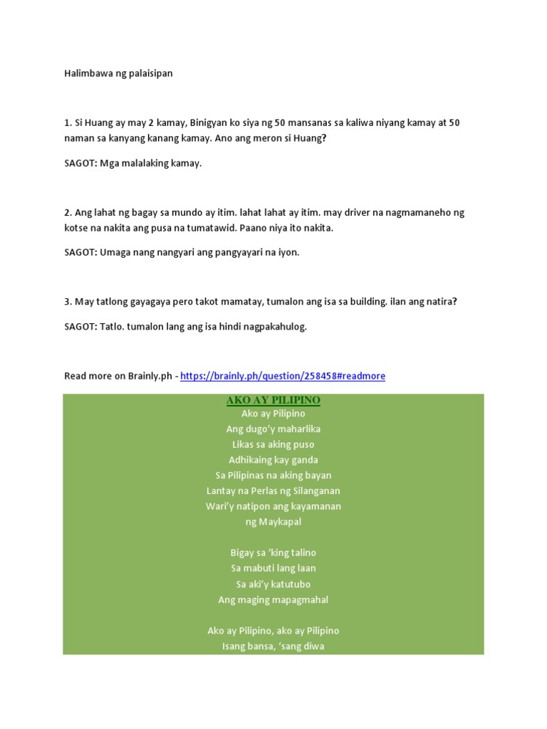 17022020 Mga Halimbawa Ng Palaisipan Bugtong PALAISIPAN HALIMBAWA Ang mga palaisipan ay kilala rin bilang mga bugtong pahulaan o patuturan. God bless at maraming salamat. 9 125 Halimbawa ng palaisipan na may sagot 000.