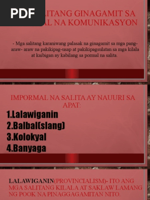 Grade 8 Presentationx Mga Salitang Ginagamit Sa Impormal Na Komunikasyon Lalawiganin Provincialism Ito Ang Mga Salitang Kilala At Saklaw Lamang Ng Course Hero