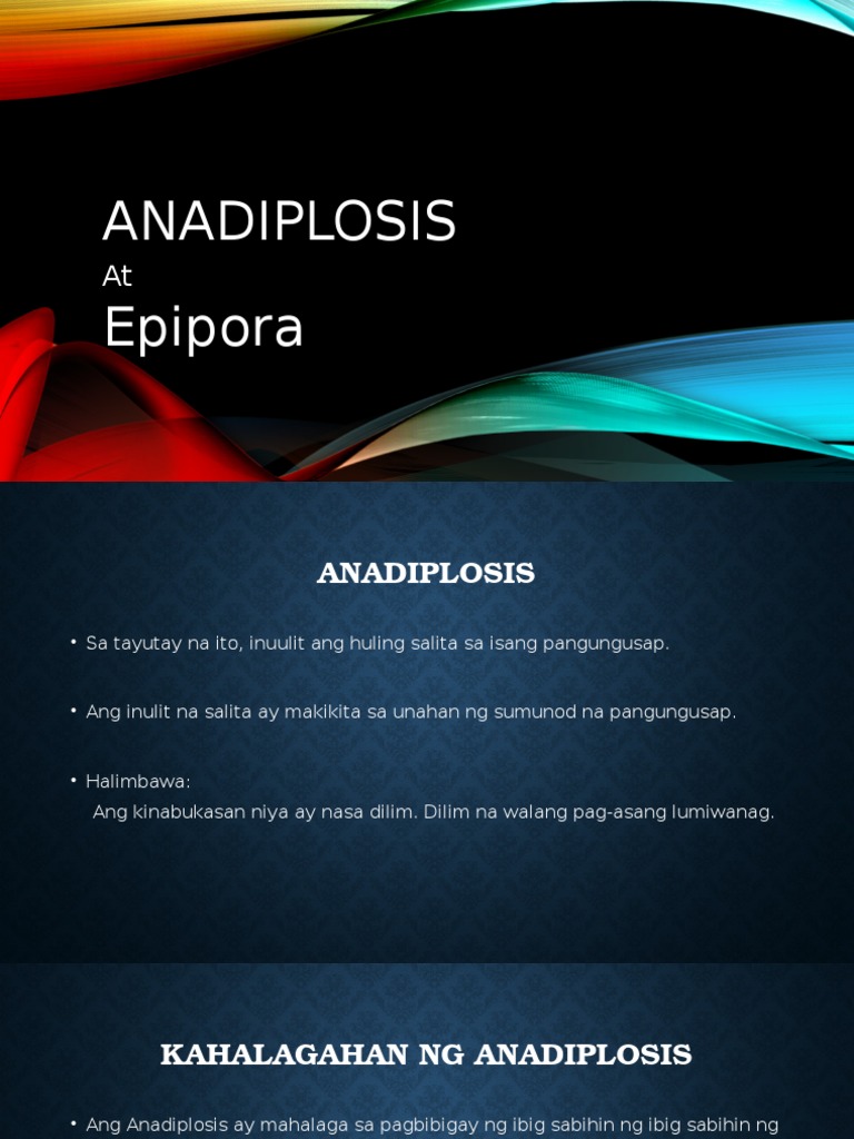 KAHALAGAHAN NG ANADIPLOSIS Ang Anadiplosis ay mahalaga sa pagbibigay ng ibig sabihin ng ibig sabihin ng huling salita. 2 Si Juan ay isang manlalaro ng basketball. 5 EPIPORA - pag-uulit sa huling bahagi ng pahayag o taludtod.