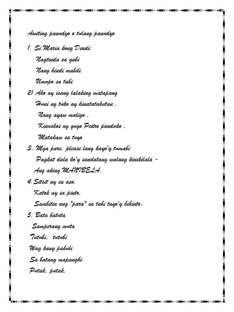 Click to expand document information. Chitchiritchit alibangbang Salaginto Salagubang Ang babae sa lansangan. 11022020 AWITING PANUDYO HALIMBAWA Halimbawa ng Tulang Panudyo.